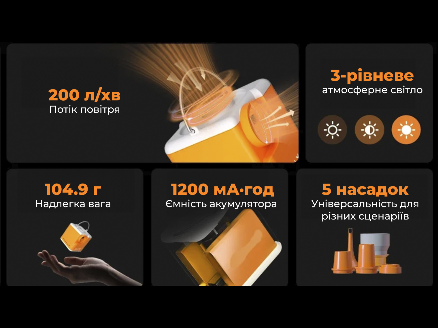 Вага 104.9 г робить насос майже невідчутним у кишені чи рюкзаку. Міцна металева ручка-петля допомагає миттєво перетворити пристрій на підвісну лампу для намету або надійно закріпити його на карабіні.