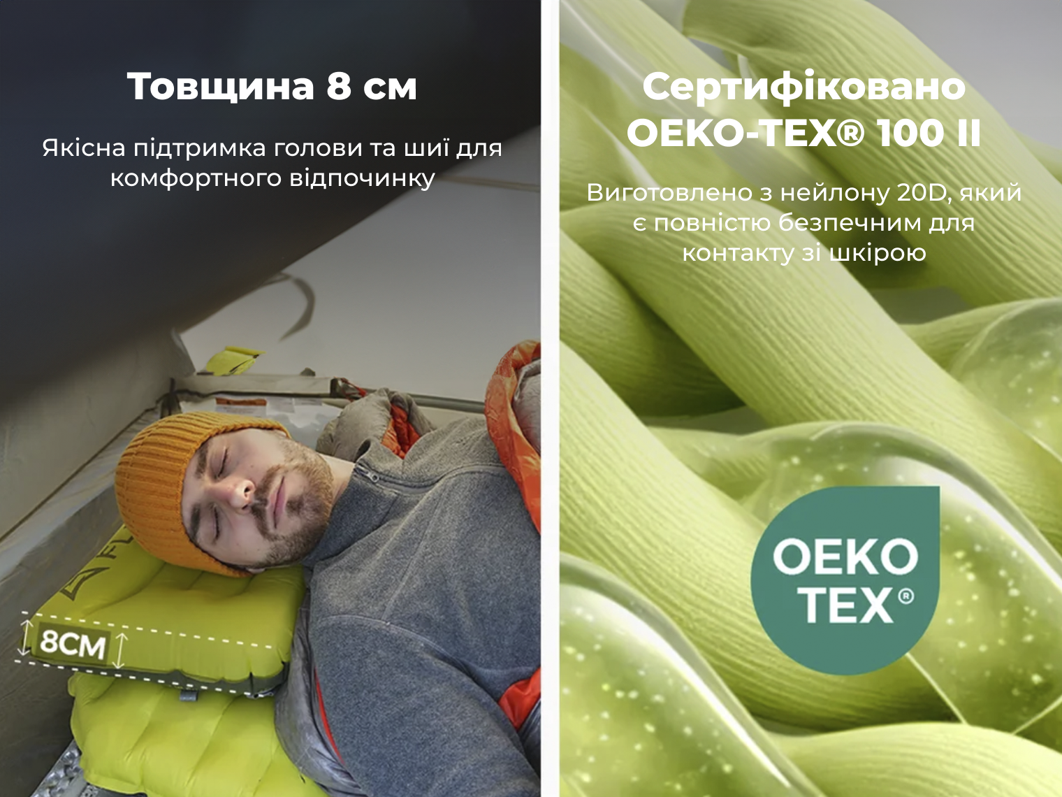 Подушка розроблена з урахуванням анатомії людини. Вигнутий профіль і центральне заглиблення фіксують голову, запобігаючи її сповзанню під час відпочинку. Висота у 8 см створює необхідну підтримку для шийного відділу, що критично важливо при використанні тонких надувних матраців.