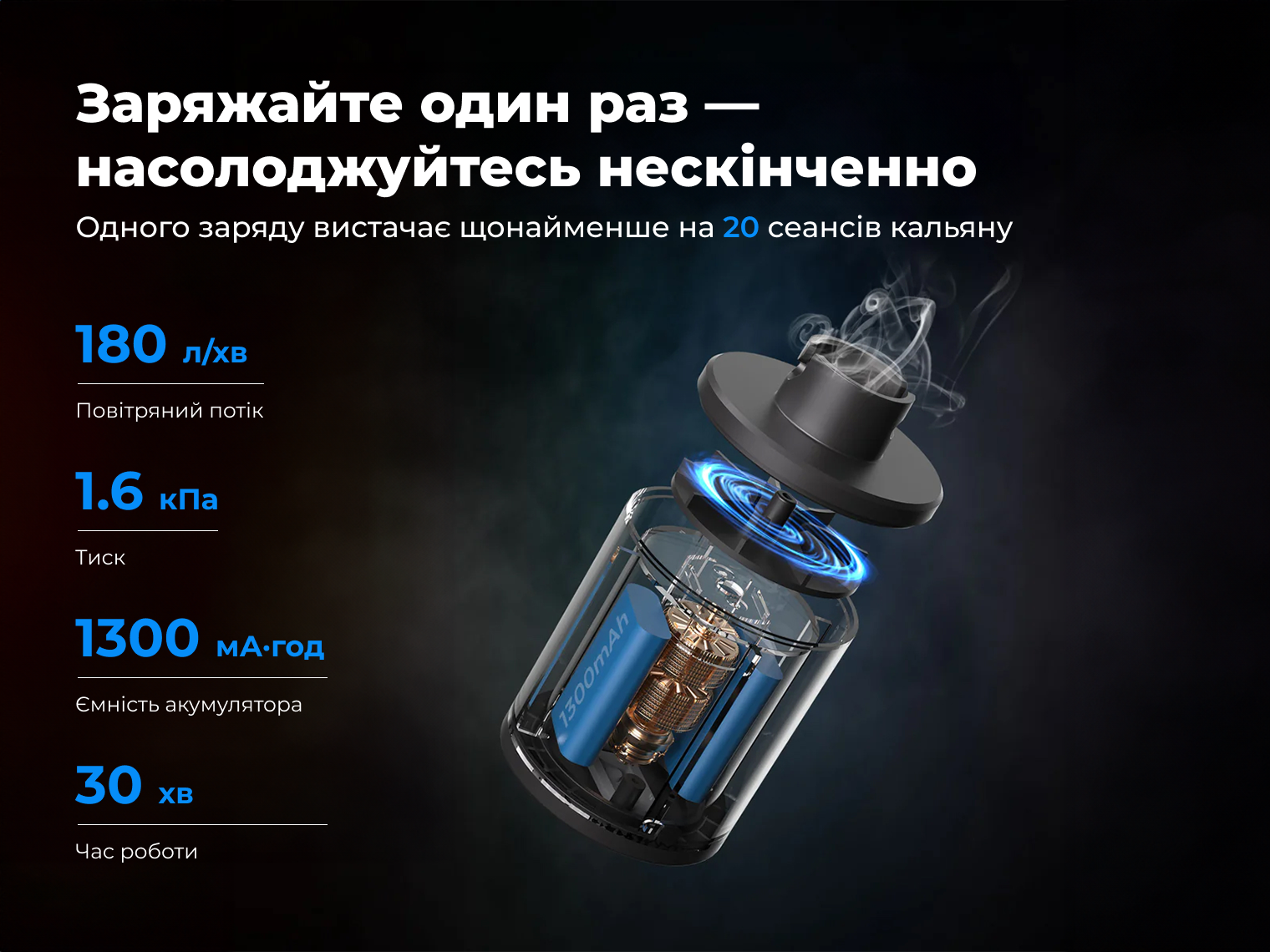 Насос має компактний циліндричний дизайн і оснащений універсальним кріпленням, що підходить для більшості стандартних кальянних шлангів. Вбудований акумулятор ємністю 1300 мА·год гарантує автономну підготовку 20+ сесій куріння без підзарядки. Завдяки роз'єму USB Type-C та компактним габаритам, насос зручно заряджати від повербанка та використовувати в польових умовах, подорожах або вдома.