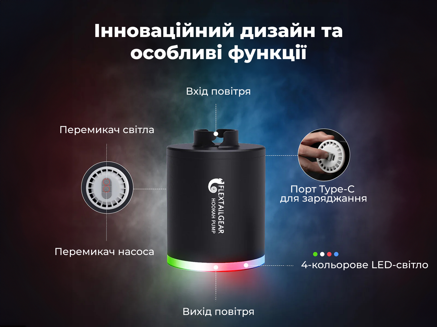 Flextail Hookah Pump — це незамінний гаджет для поціновувачів кальяну, який автоматизує процес підготовки до куріння. Пристрій бере на себе найважчу частину — прогрів тютюну та розкурювання вугілля, що дає змогу насолоджуватися густим димом відразу після підключення.
