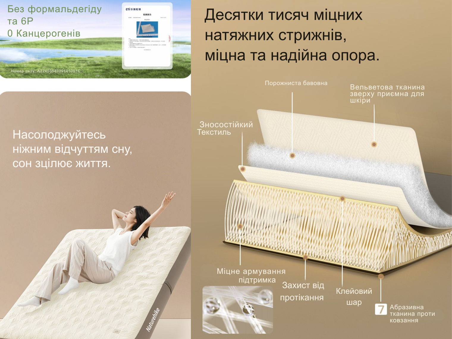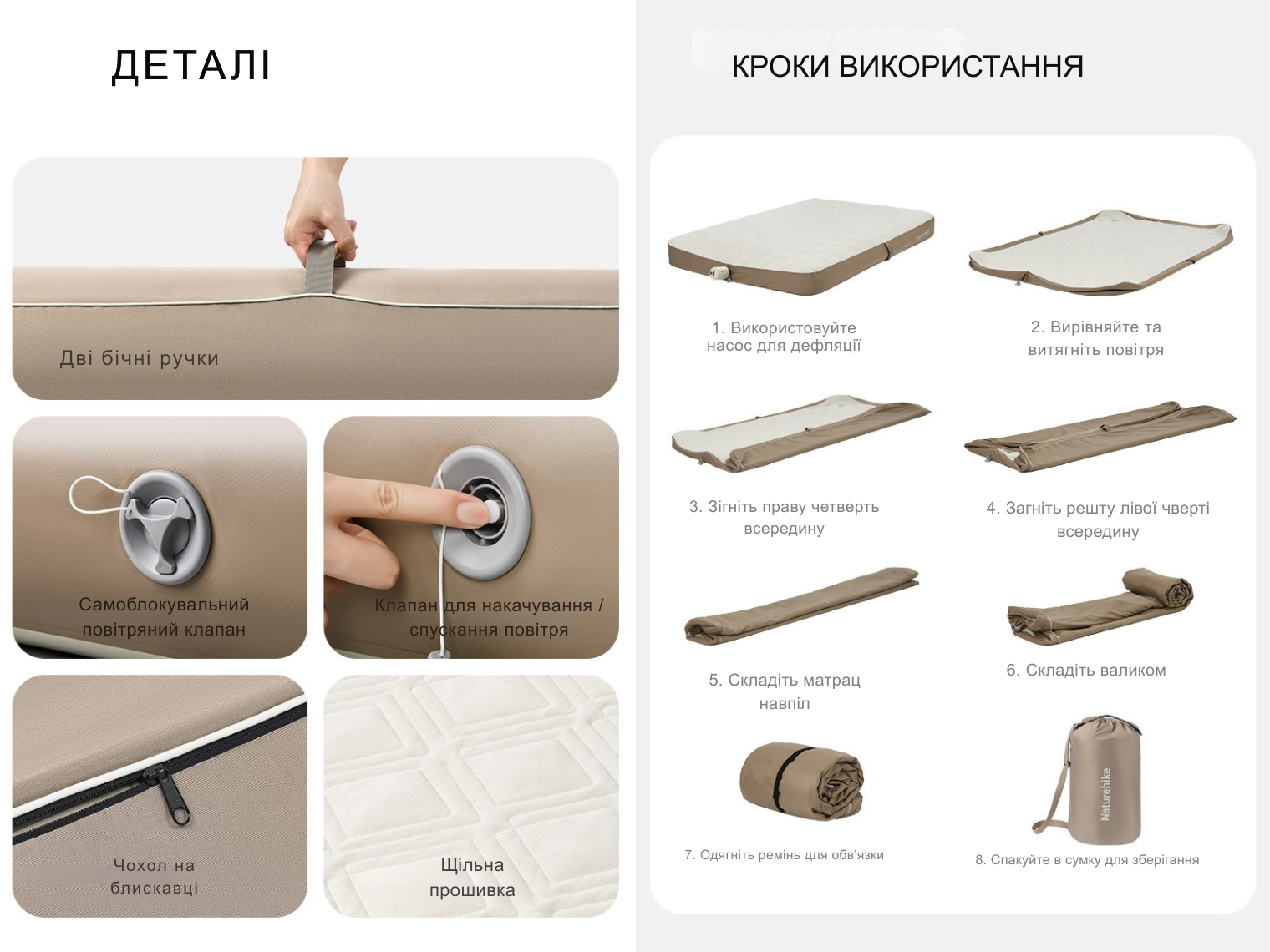 У надутому вигляді висота матраца сягає 25 см, створюючи надійну ізоляцію від холодної поверхні землі та зберігаючи природне тепло. Конструкція забезпечує рівномірну підтримку тіла та знижує навантаження на суглоби, сприяючи повному розслабленню та здоровому сну.