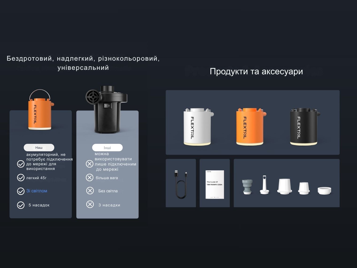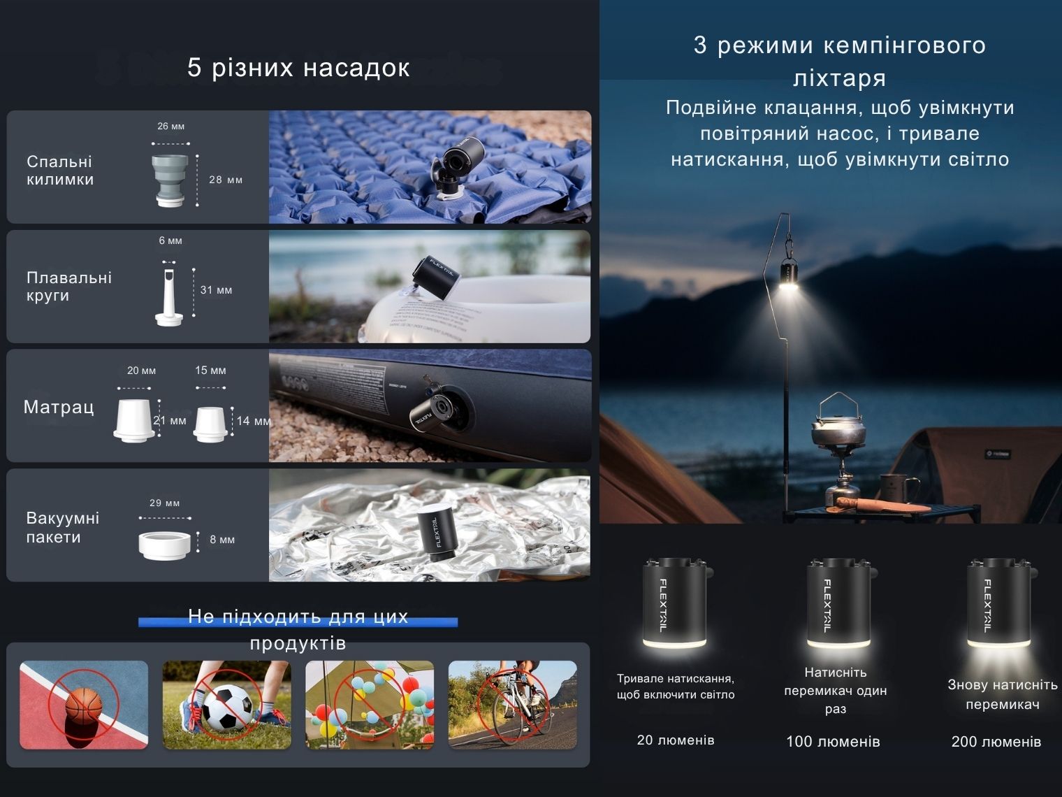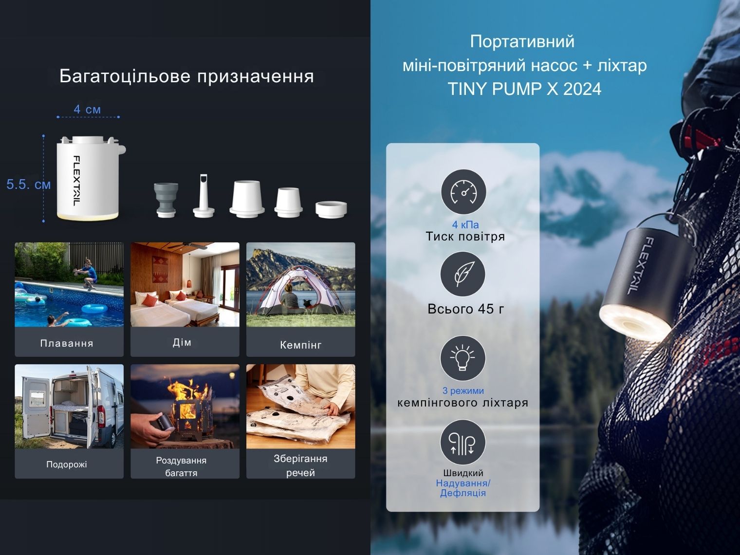 Flextail Tiny Pump X — це функціональний пристрій 3-в-1 для накачування та здування виробів, а також м'якого освітлення невеликого простору.