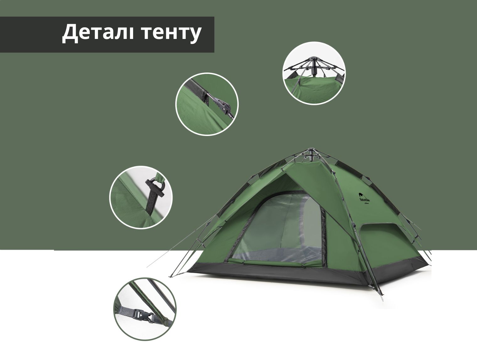 NH21ZP008 — це трисезонний намет від компанії Naturehike. На відміну від класичних аналогів, ця модель має конструкцію, що саморозкладається. Це полегшує і прискорює весь процес встановлення, не вимагаючи від користувача спеціальних навичок. Одна з корисних особливостей конструкції — можливість демонтажу зовнішнього намету та використання моделі як мініатюрний навіс, під яким можна сховатися від сонця (тканина здатна блокувати близько 98% УФ-променів).