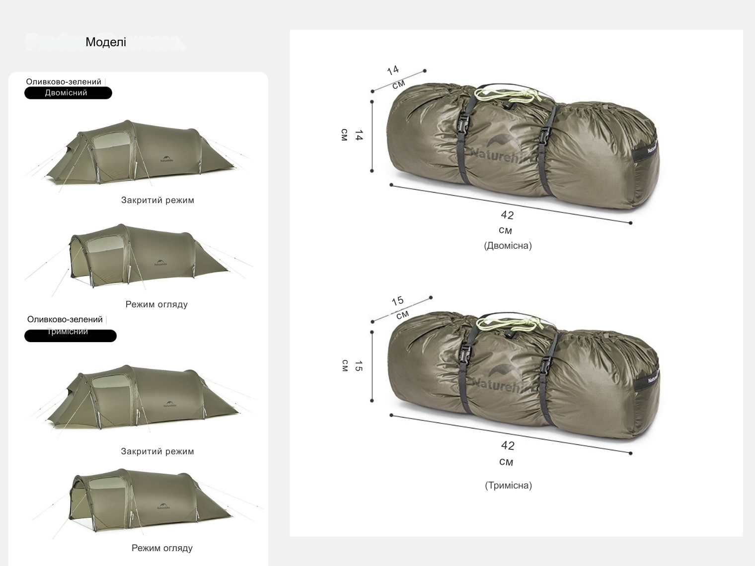 Загальні габарити намету після встановлення сягають 390 х 150 х 105 см. Розміри зони для сну — 210 х 100 см, що ідеально для двох осіб. Попереду є просторий тамбур для зберігання рюкзаків, взуття та обладнання, щоб звільнити житловий простір.