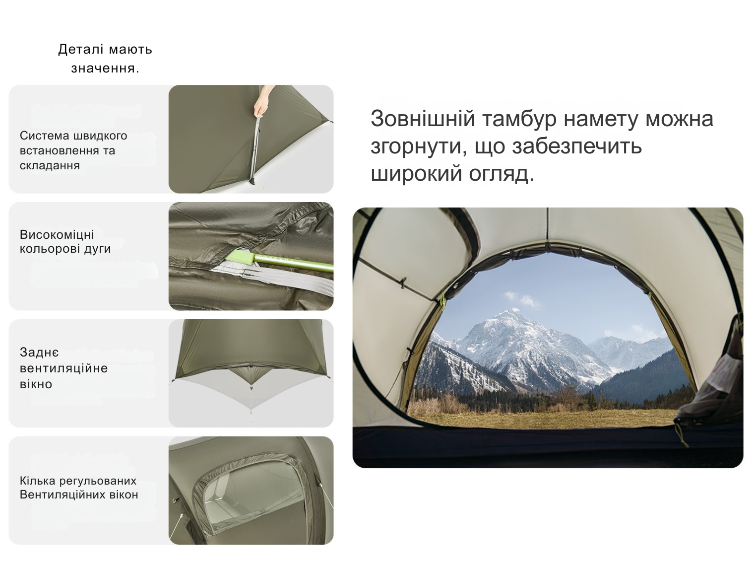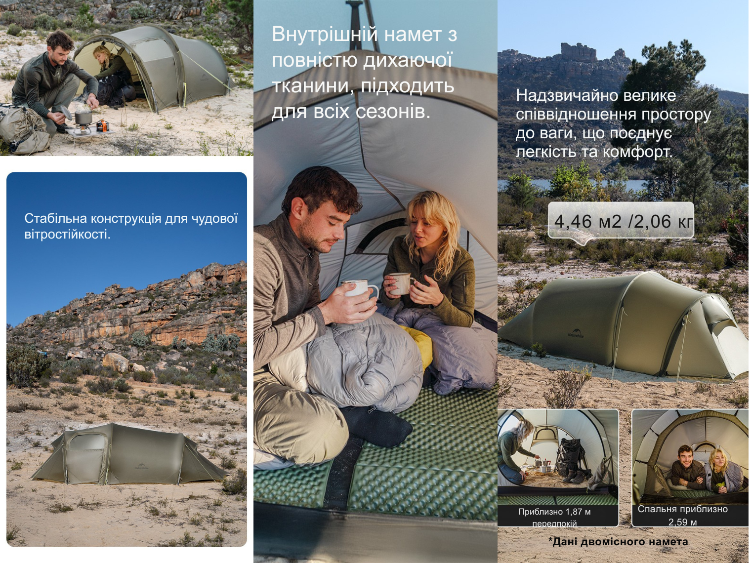 Завдяки двошаровій конструкції намет Naturehike Opalus захищає від опадів, вітру та конденсату, зберігаючи тепло в холод та забезпечуючи вентиляцію спекотного дня: