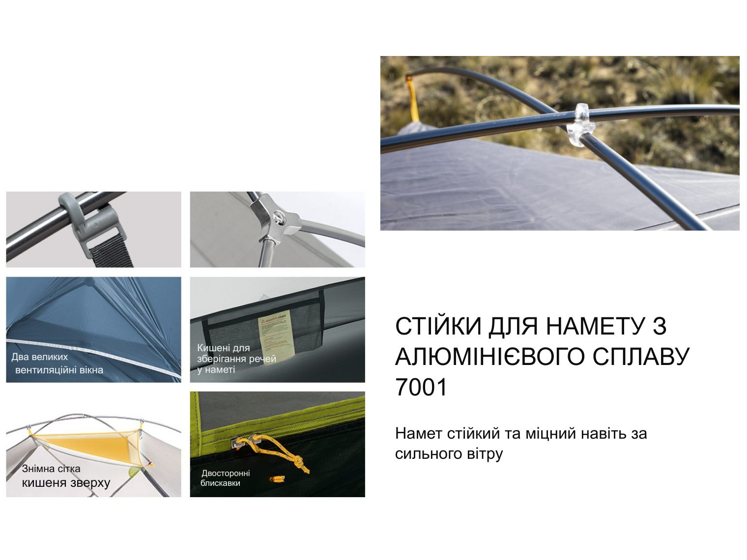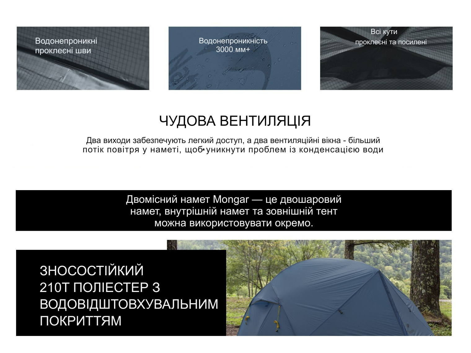Конструкція намету Naturehike Mongar складається з 2 окремих частин: внутрішнього намету з сіткою та зовнішнього тенту, стійкого до дощу, вітру та сонця. У теплу пору року можна використовувати лише внутрішню частину — спати під зоряним небом та насолоджуватися прохолодою. Тент за необхідності перетворюється на окремий навіс, коли потрібно організувати тінь або укриття для відпочинку.