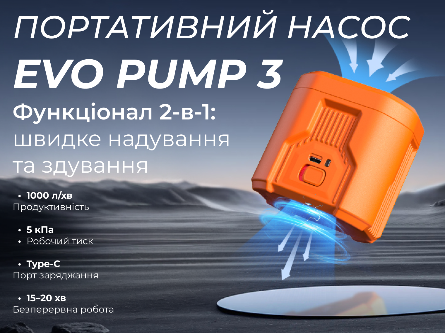 Забудьте про довге надування виробів вручну! Компактний насос Flextail Evo Pump 3 підходить для використання на активному відпочинку, в кемпінгу або на пляжі, де потрібне швидке накачування використовуваних виробів. За допомогою цього пристрою ви можете надувати туристичні матраци та килимки, пляжні м'ячі, круги для плавання, човни та інші предмети без зайвих зусиль лише за кілька хвилин!