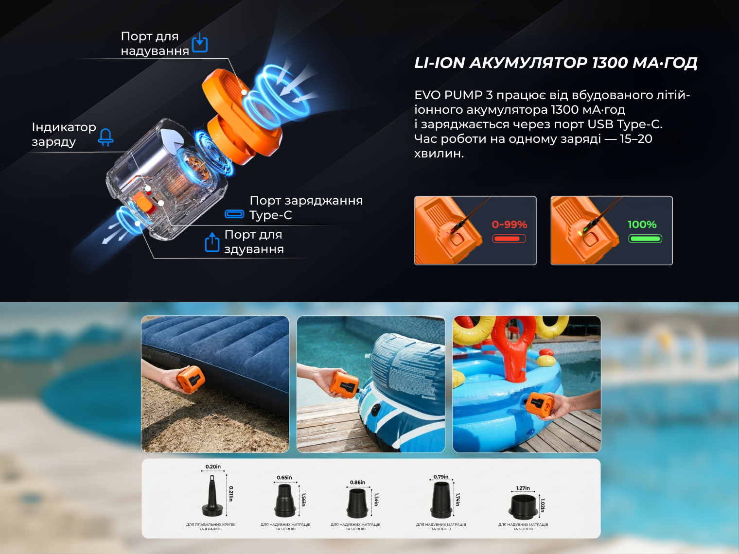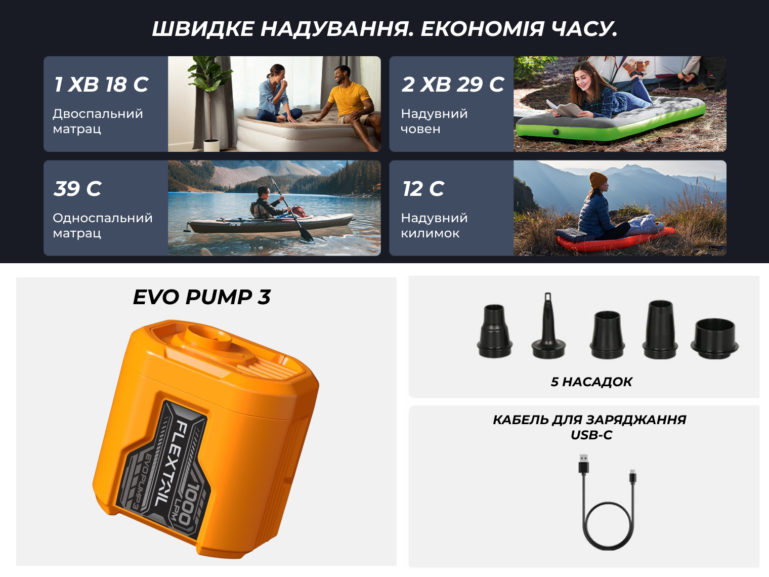 Насос повітряний Flextail Evo Pump 3, зарядний кабель USB Type-C, 5 насадок.