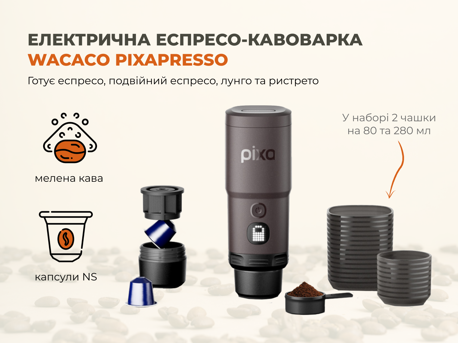Wacaco Pixapresso — перша в історії бренду Wacaco електрична еспресо-кавоварка. З її допомогою ви можете готувати улюблений гарячий напій, де б не знаходилися: вдома, на роботі, на пікніку або подорожі. Все, що вам потрібно, — улюблена кава, вода та не більше 5 хвилин часу! Еспресо готується 3 хвилини.