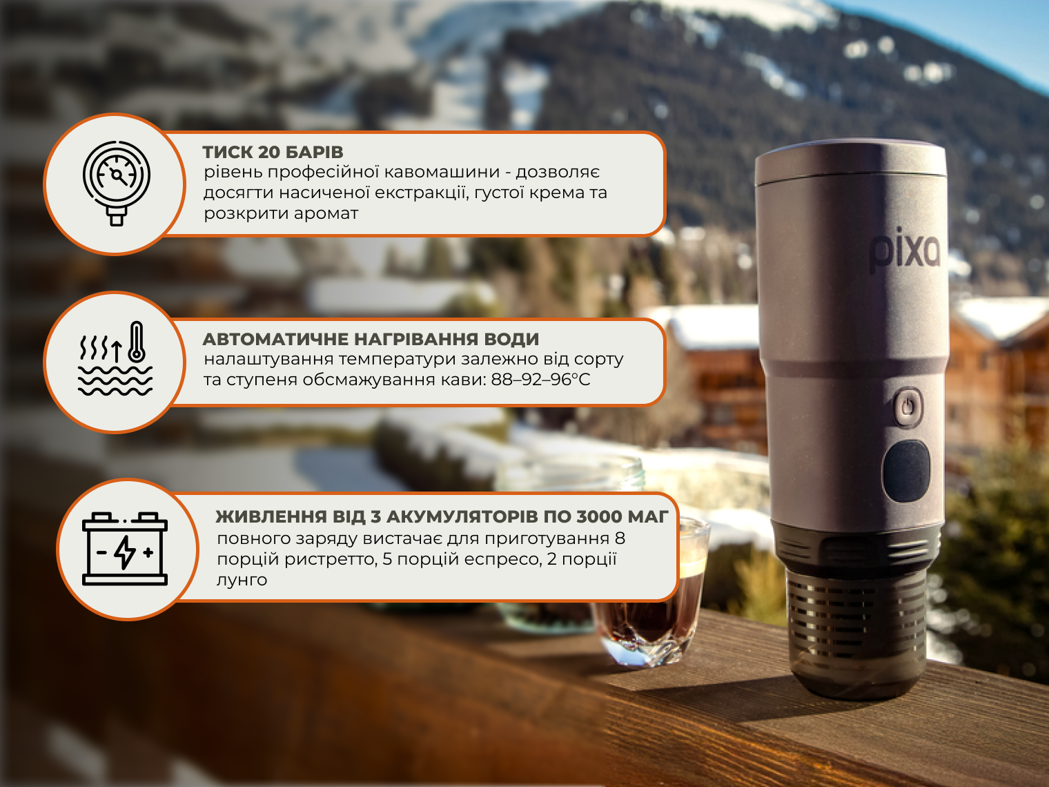 Корпус стійкий до водяних бризків, але його не можна повністю занурювати у воду або мити в посудомийній машині. З урахуванням компактності 74 х 74 х 181 мм та чохла в комплекті, Pixapresso поміщається у рюкзаку, сумці або бардачку автомобіля, щоб ви насолоджувалися улюбленими напоями у будь-якій точці світу.