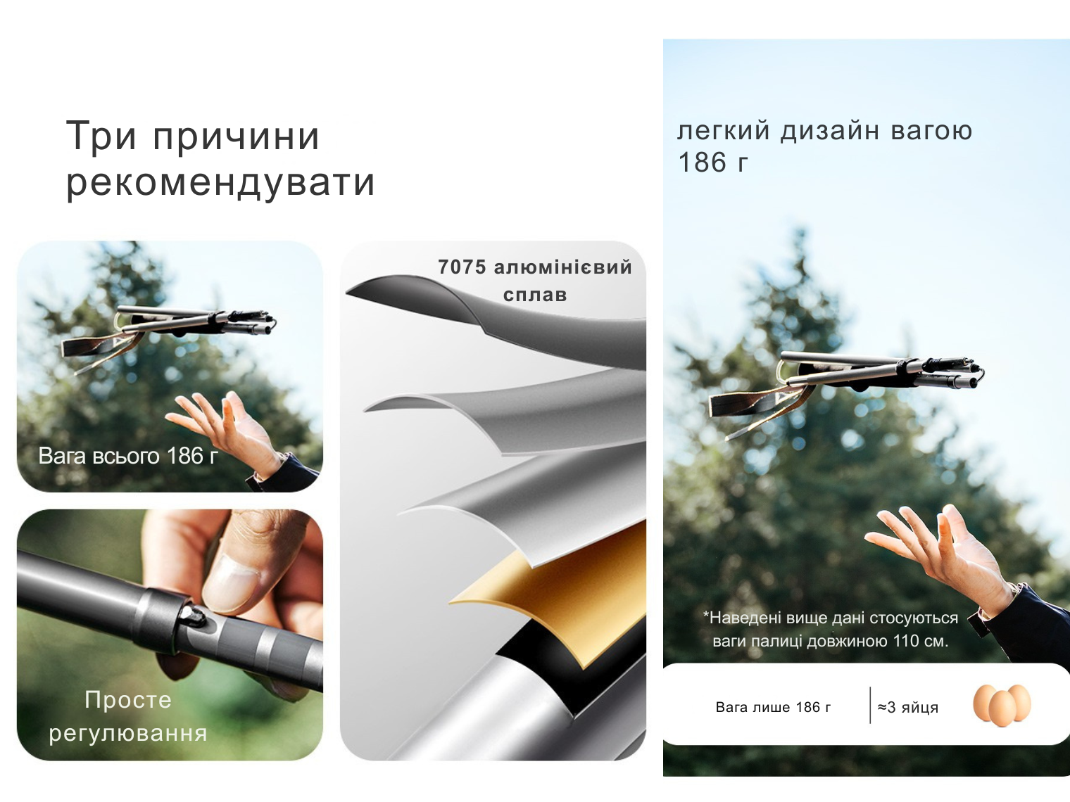 Конструкція складається до 37 см у довжину та важить лише 198 г, що спрощує транспортування в сумці або на рюкзаку.